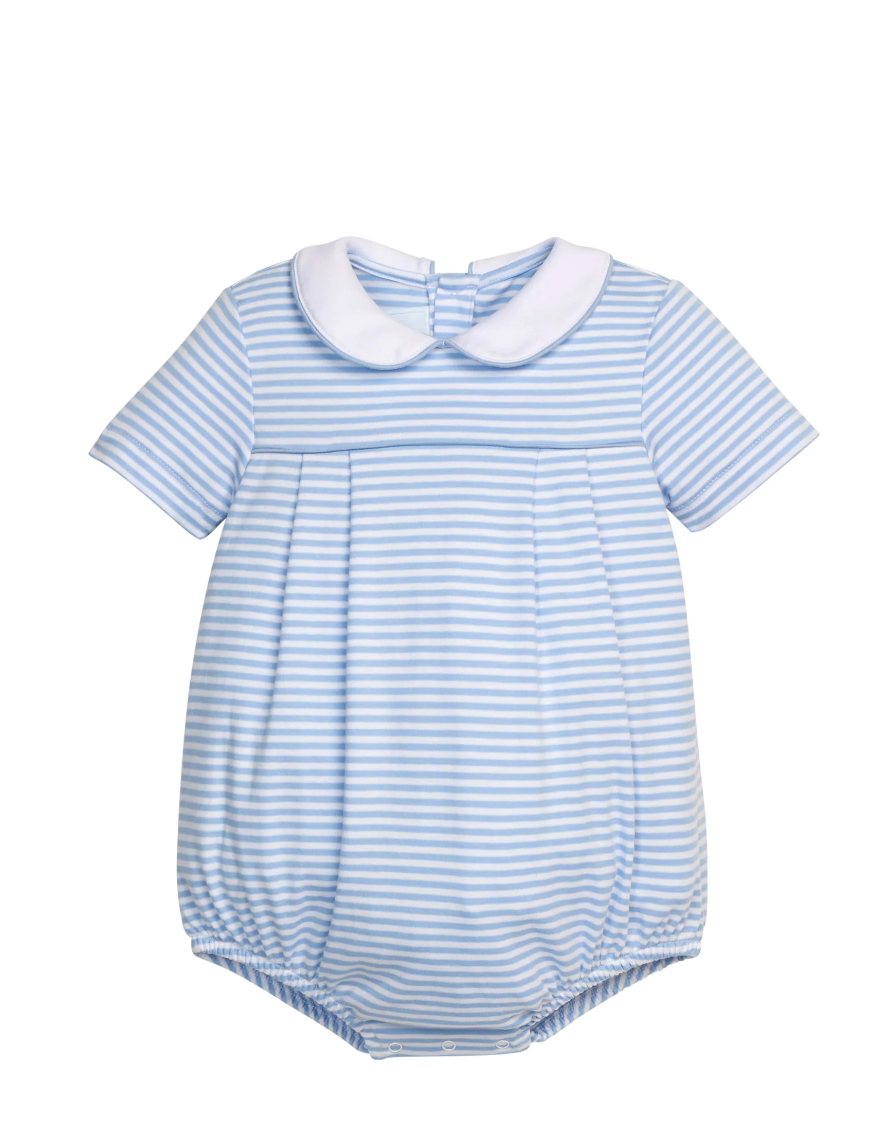 This pleated bubble is a wonderful short sleeve option for baby boys this season. Made from 100% cotton, this light blue and white striped style features a white peter pan collar with piping and pleats across the chest and back. Classic, timeless, and oh-so comfortable, this soft, knit bubble will be an everyday wardrobe staple for your little boy all year long.