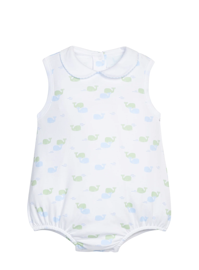 Made from the softest 100% Pima cotton, this printed bubble features playful blue and green whales and light blue picot trim along the peter pan collar. A cheerful choice for baby boys, this sleeveless bubble will make a splash! It has a snap back and bottom.
