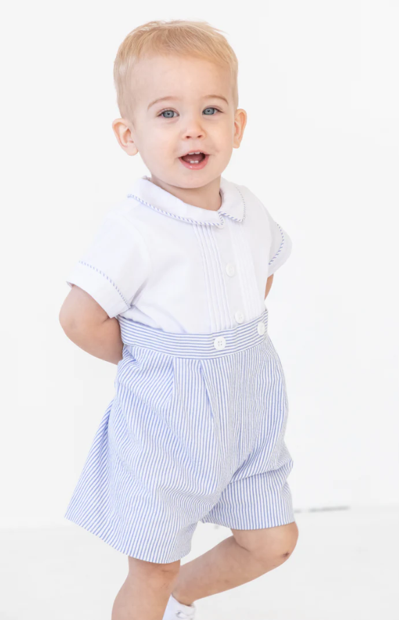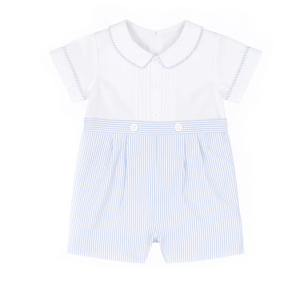 This one piece suit is perfect for any special occasion. It has a seersucker bottom and white sail collar with blue piping.  Zipper back for ease in wear.  Fully lined.