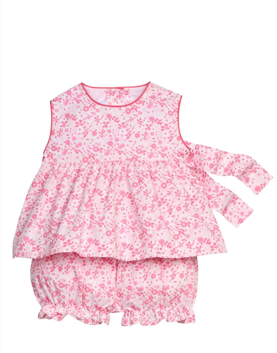 This bloomer set features pink azalea florals on a timeless designs. It features a sleeveless top with pink piping at the neck and sleeves, gathers at the chest, and a self-tie sash in back for the perfect fit. There is a button back and matching bloomers feature an elastic waistband to make dressing your baby girl a breeze.