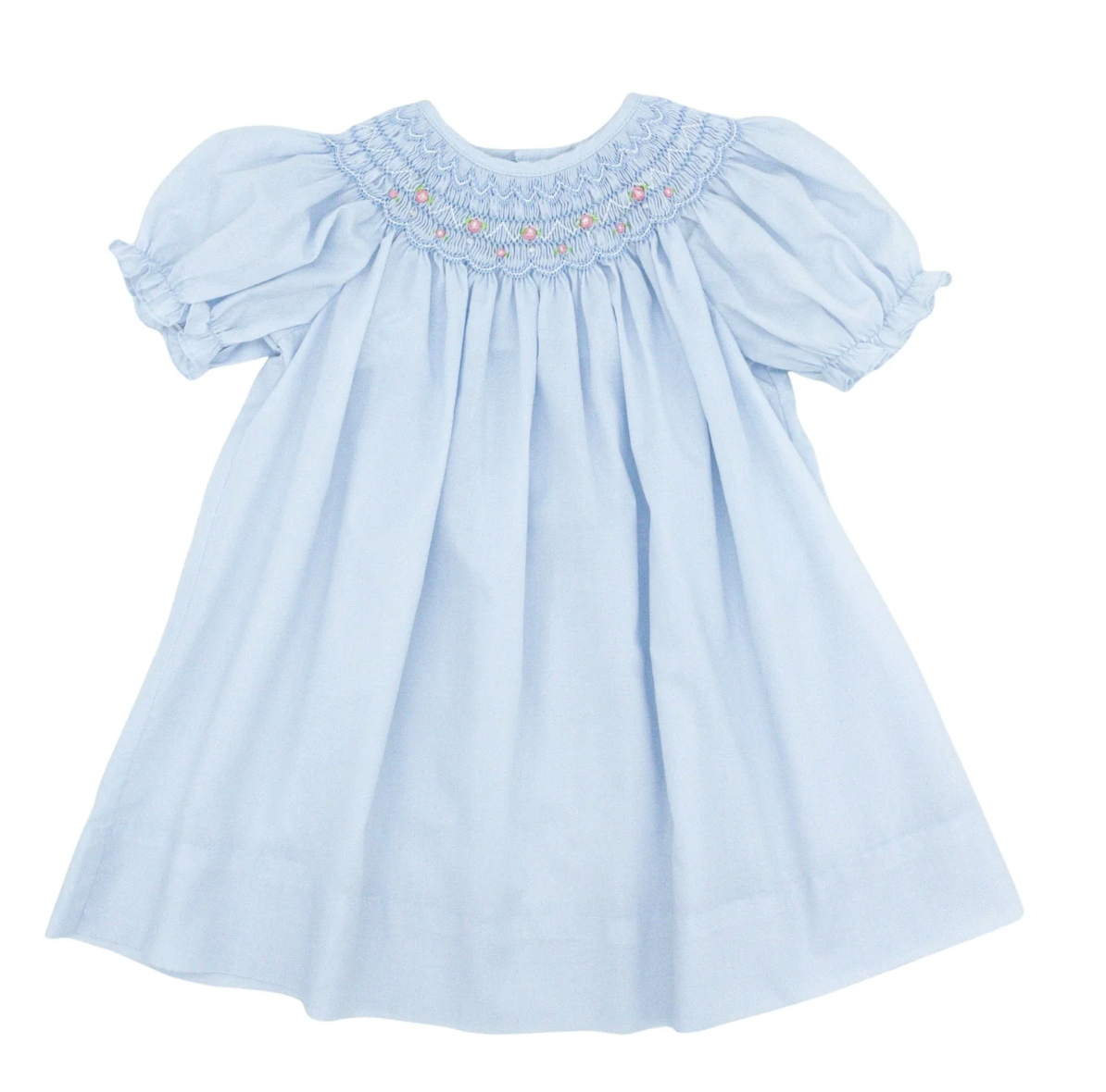 If you're looking for a timeless dress for your little one, this Bishop Dress in Blue is the perfect choice! Featuring classic geometric smocking and delicate rosebud and pearl details, this dress exemplifies traditional elegance. It's ideal for special occasions or everyday wear! It has a button back and matching blue bloomers.