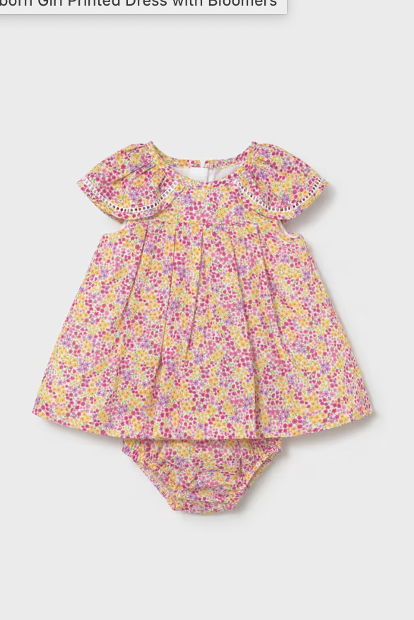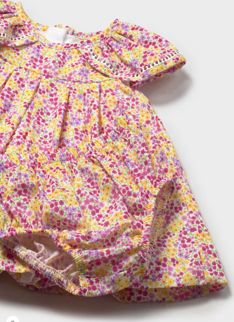 This capped sleeved dress is covered with colorful spring and summer flowers. It is lined, has ilet detailing and comes with bloomers. Zipper back