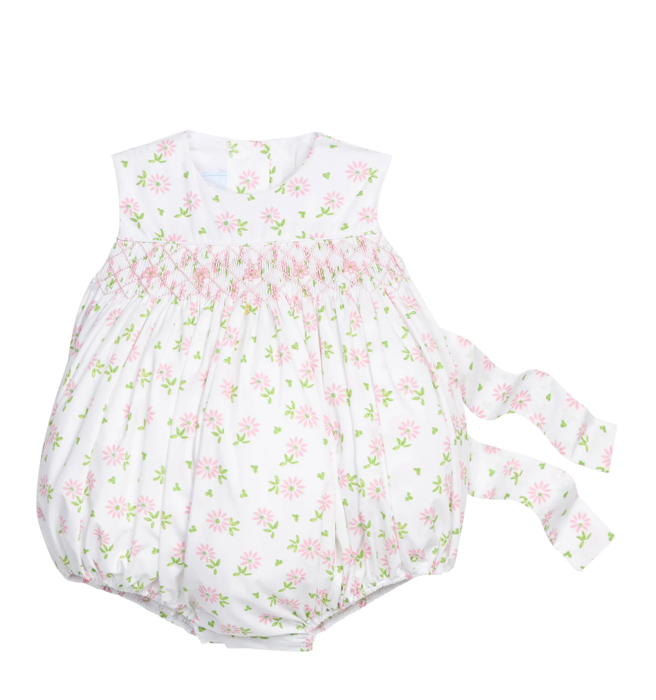Featuring a sleeveless silhouette, beautiful hand-smocking, and a sash in back, this smocked bubble is heirloom-quality. Perfect for Easter celebrations, garden gatherings and beyond. It has a button back and bottom snaps.