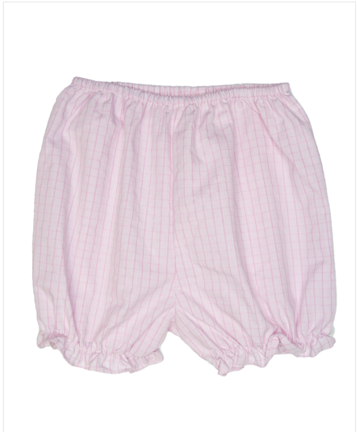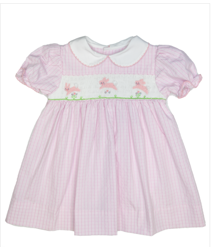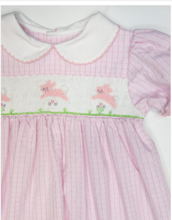 Featuring heirloom-quality handcrafted details like hand bishop scalloped smocking and embroidered flowers and bunnies this piece is sure to become a treasured keepsake. The light weight fabric keeps little ones cool and comfortable and is easy to care for. It has a button back and matching bloomers.