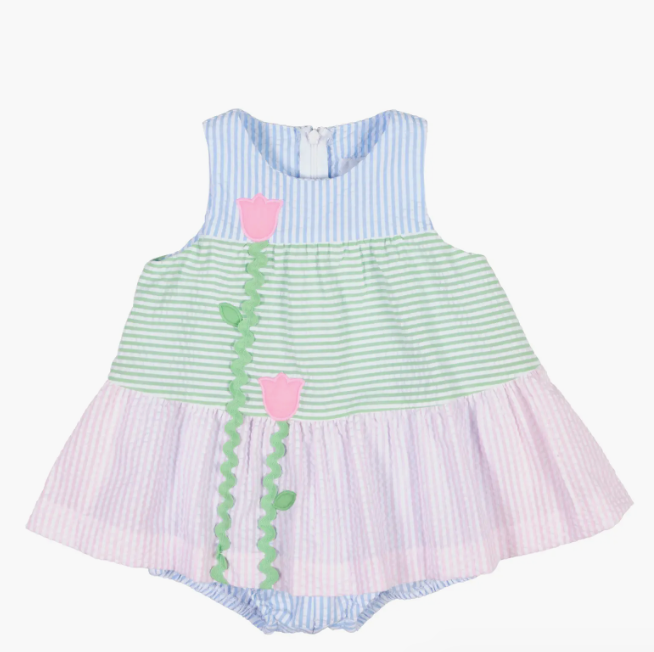 Fresh and playful, this romper is crafted from pastel pink, blue, and green stripe seersucker for a light, breezy feel perfect for warm-weather days. Appliqué tulips bloom across the front with green ric rac stems, adding cheerful color and charming detail. Designed with a softly shirred, tiered skirt for movement, elastic leg openings for comfort, and an invisible front-to-back rise zipper for easy changes, it’s as practical as it is sweet.