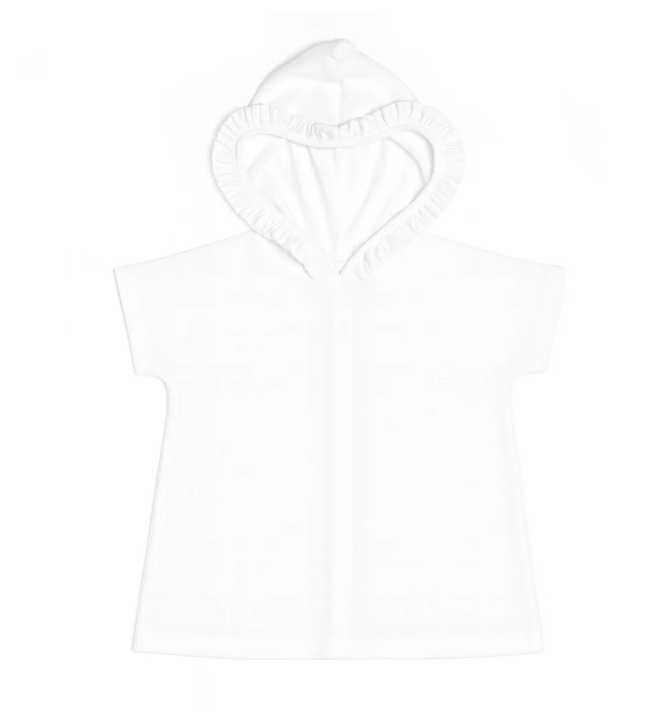 This white knitted terry cloth cover has Kimono sleeves and a Velcro closure making it an an easy on and off. The darling ruffle trimmed hood is a perfect warm up for your little one when she gets out of the pool!