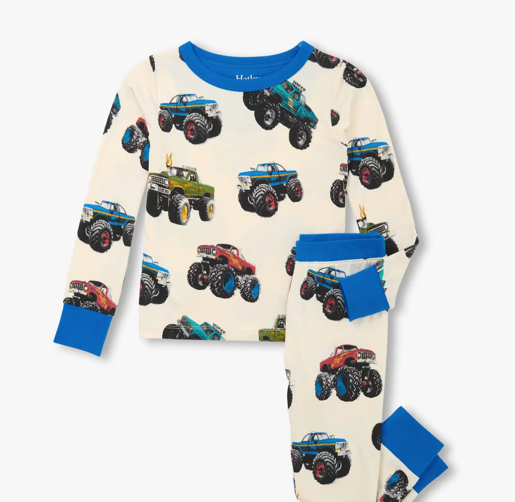 This mega Monster Trucks Bamboo Pajama Set delivers bedtime excitement with unmatched comfort. Crafted from luxuriously soft stretch bamboo fabric, this 2-piece PJ set features a natural background covered in bold, grainy blue, red, and green monster trucks. Designed for comfort and movement, it includes a wide elastic waistband, cuffed wrists and ankles, and a matching blue neckline and trims.