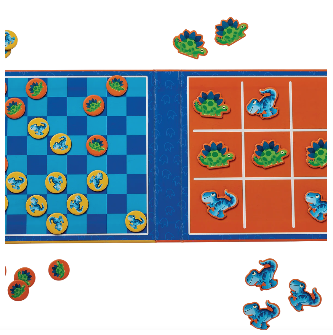 Double the fun with this portable magnetic game set featuring adorable dinosaur characters! Perfect for road trips, restaurants, or quiet time at home, this compact game board offers two classic games that kids love. The magnetic pieces stay securely in place, making it ideal for play anywhere. Made of 70% recycled materials.