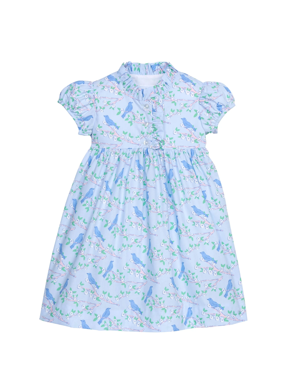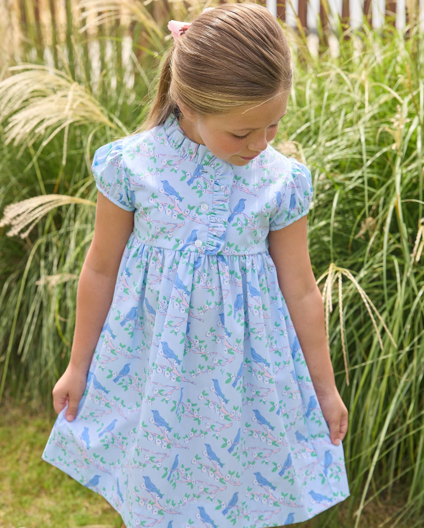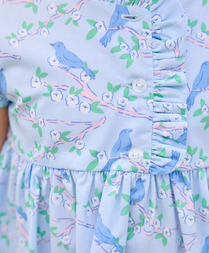 This Cherry Blossoms Dress features a charming print of blue birds on cherry blossoms set against pale blue. The Birdie Dress is a classic style for little girls with capped sleeves, a ruffled placket, and gathers across the chest. It’s easy to create picture-perfect looks for your girls with this classic dress.