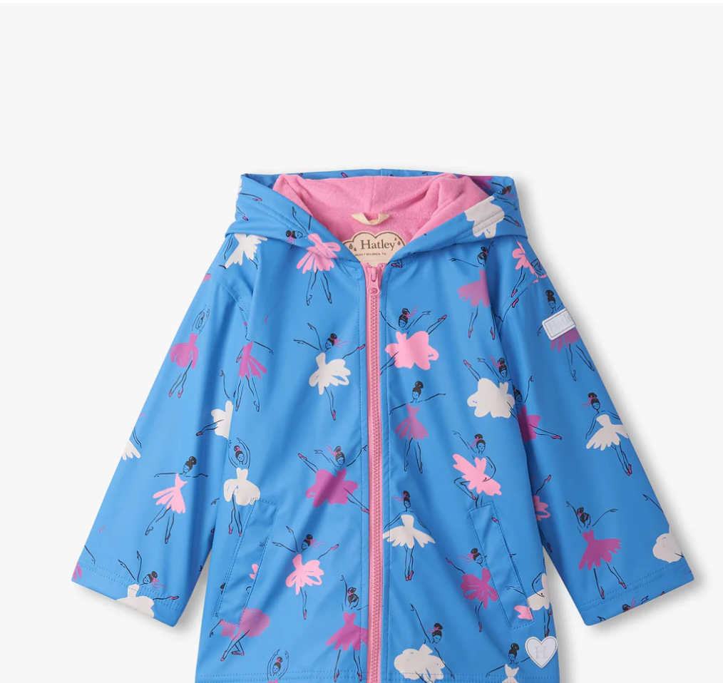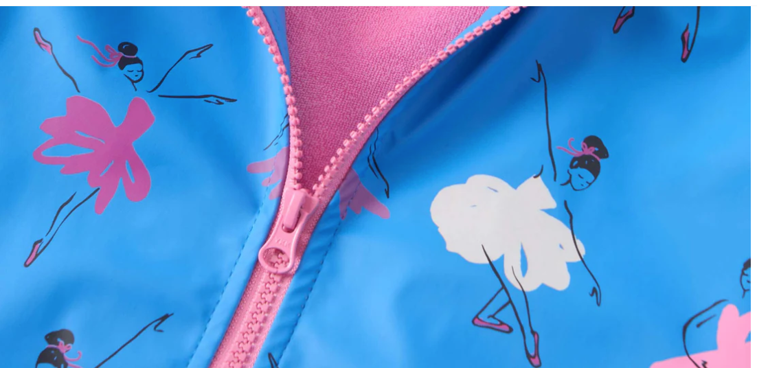The Girls Ballet School Colour Changing Zip-Up Rain Jacket in Blue turns grey days into great days with its vibrant electric blue background and playful all-over print of black-outline ballerinas in white, light pink, and dark pink dresses, some transforming in colour when exposed to water. Made with a waterproof PU-coated shell and lined with soft pink sherpa, including in the hood, it keeps her warm and dry through every downpour. A zip-up front with an exposed pink zipper adds easy layering, while the full hood and playful pink bows completes the look.