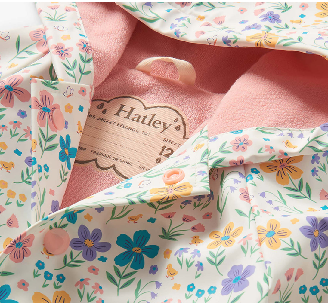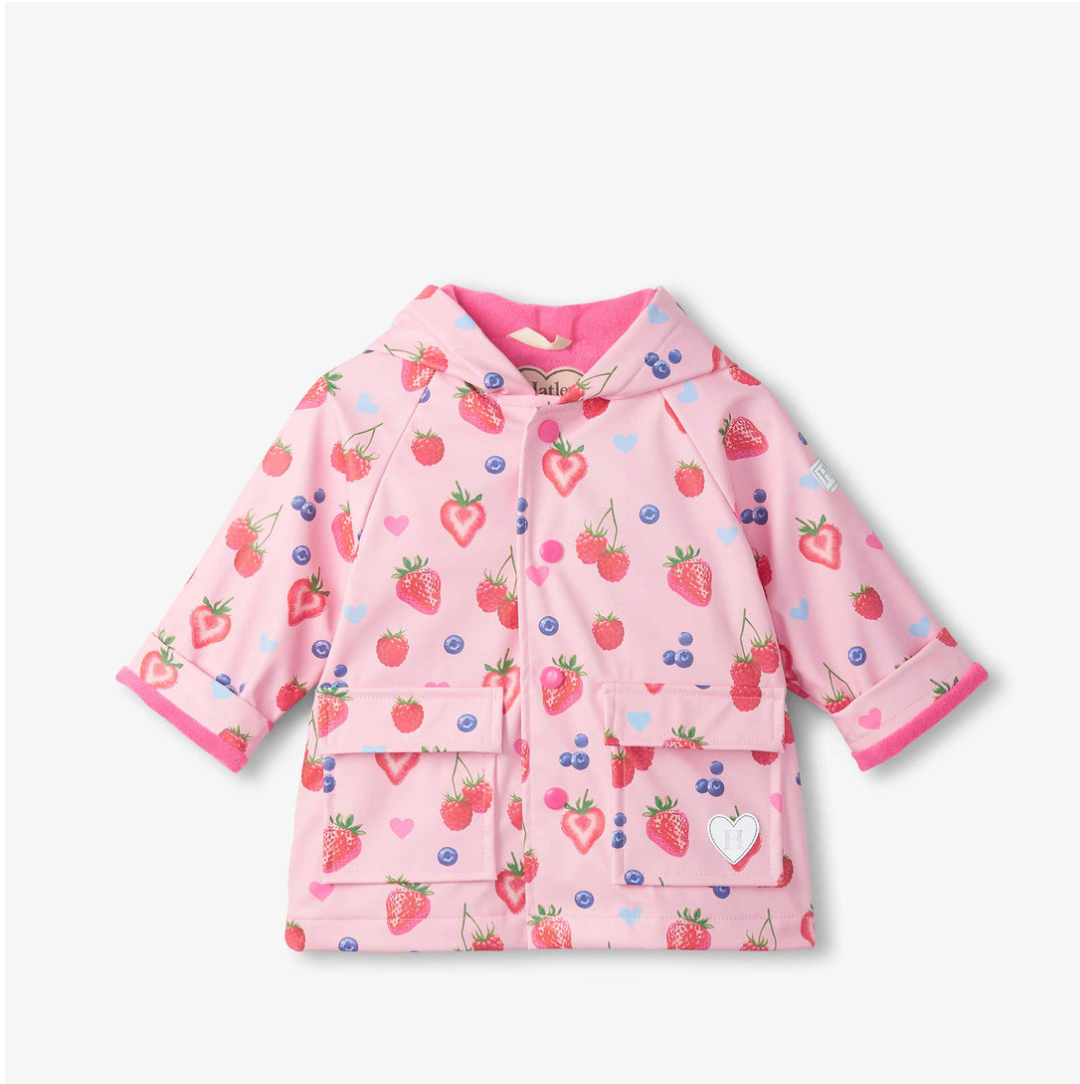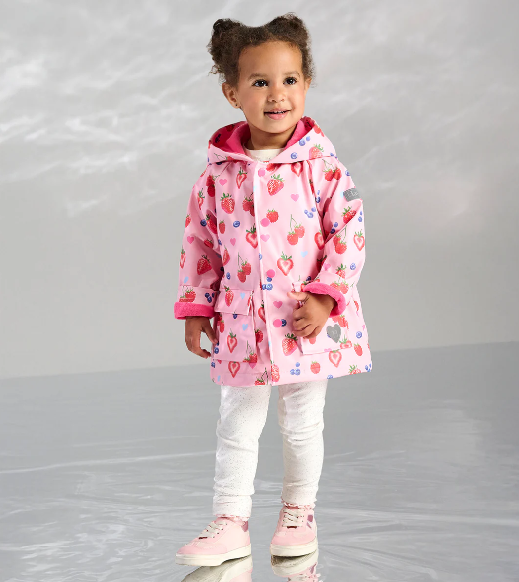 Sweeten up stormy days with this rainy day jacket Designed with a soft blush pink background and an all-over print of strawberries, raspberries, blueberries, and tiny heart motifs, this waterproof jacket is as fun as it is functional. It features a cozy, bright pink lining for added warmth, matching bright pink buttons for a cheerful pop, and practical front patch pockets for keeping hands dry or treasures safe.