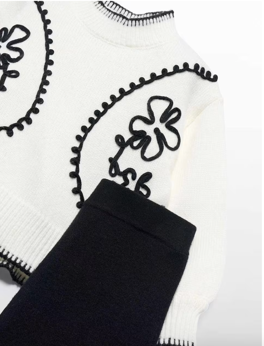 This soft and stylish pants set has embroidered flower design and detailing at the collar, sleeves and waist. The pants have a wide leg and are pull on for comfortable fit.