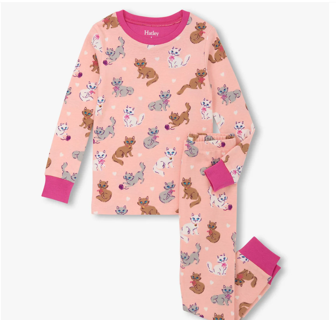 This kitties cotton pajama set in Pink is purr-fectly cozy with its snug-fitting cotton design and playful all-over kitten print. Grey, white, and brown cats play with yarn surrounded by hearts on a heathered pink background, accented with bold fuchsia trim at the neck, cuffs, and ankles. This soft two-piece set makes end-of-the-day routine extra fun.