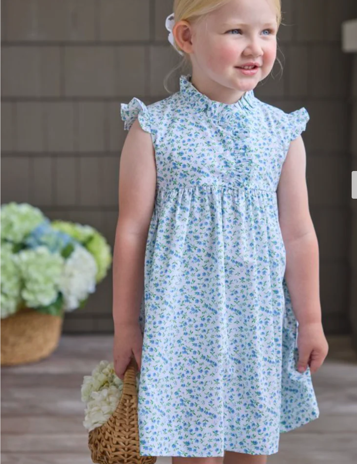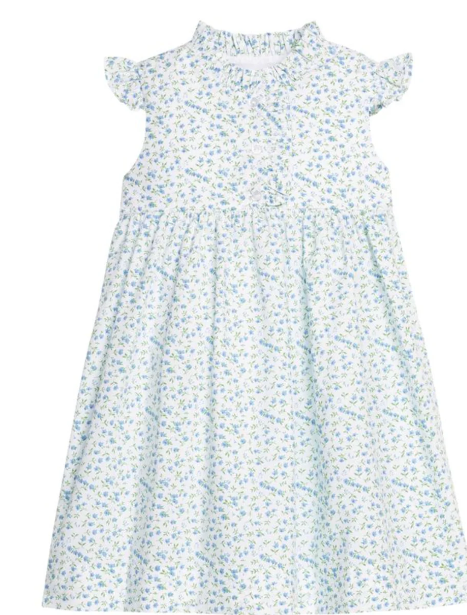This sweet dress is a timeless piece that transition from casual to special occasions. With a soft blue/green on white floral print and ruffle front and sleeves. It is crafted for comfort and durability.