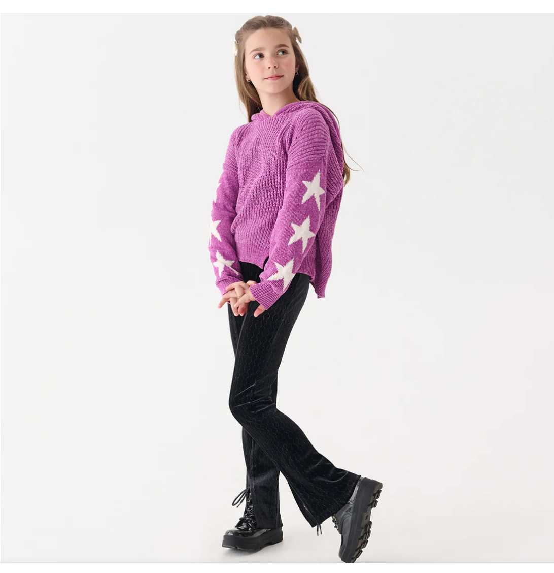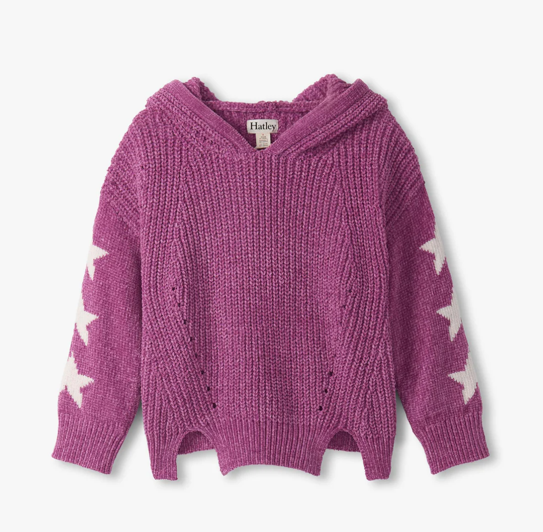 Cozy meets playful in this radiant orchid chenille pullover sweater, crafted from ultra-soft chenille yarn for a plush feel. This relaxed-fit sweater comes in a rich purple hue with a chunky ribbed knit pattern, finished with tighter ribbing at the cuffs and hem for structure. Bold white star motifs line both sleeves, adding a fun, standout detail. The scalloped hem features small notched slits at the front and back, giving the silhouette a modern twist while ensuring ease of movement.