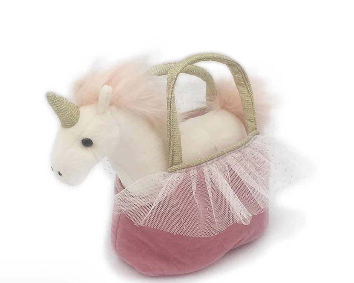 Tote around your pet bestie in their very own pretty toy purse! A pint sized Ophelia the Unicorn comes in a beautiful novel velour bag, trimmed in soft glitter tulle and gold handle. Detachable plush stuffed animal comes inside the purse. Plush measures 7 inches.
