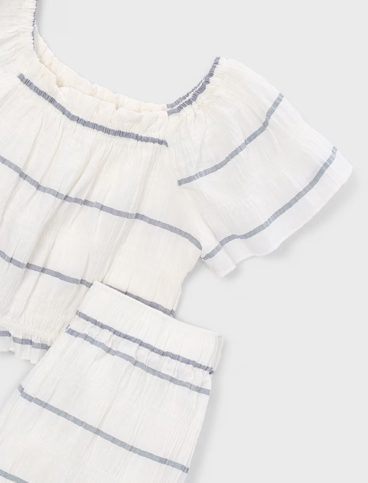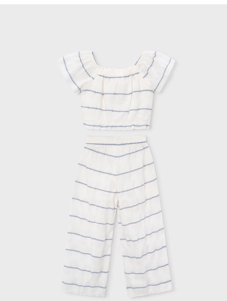This stylish lightweight cotton/linen set has wide leg pants, gathered top and capped sleeves. It features a crushed fabric look with porcelain stripes. Perfect for hot summer days.