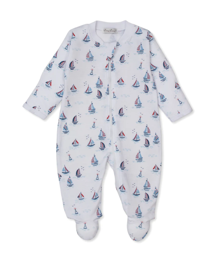 Playfully patterned with a red, white, & blue regatta print, this cozy, zippered footie for your precious baby is made from the softest Pima cotton for ultimate comfort. Zipper center front.