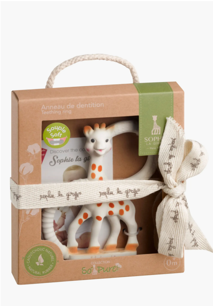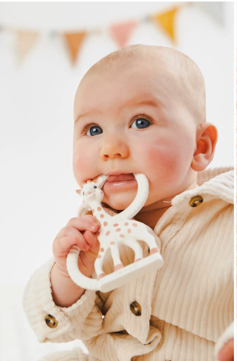 The size and shape of this teether is just right for little hands to hold, while the variety of textures helps soothe painful gums. Born in France in 1961, Sophie the Giraffe has a long history of helping teething babies. Appealing vanilla lightly flavors the natural rubber design detailed with food-grade paint. Suitable from birth.
