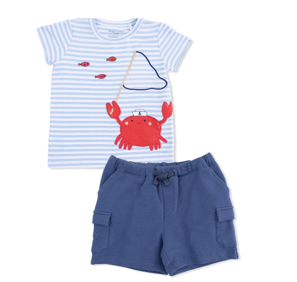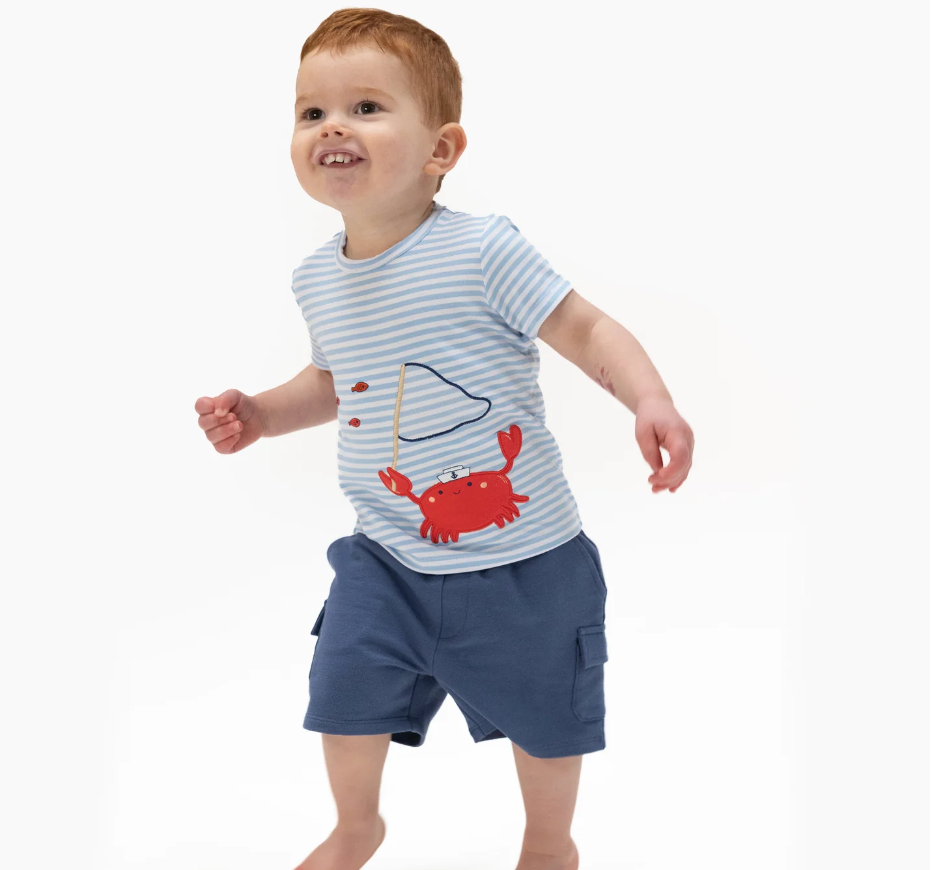 Get your little one ready for adventure with this crew neck tee and cargo short set! The tee is made from soft Viscose from Bamboo and features an adorable crab with flag applique and little fish. The cargo shorts are crafted from cozy organic French terry, with a drawstring waist and functioning pockets. Perfect for playdates, park trips, or everyday fun!