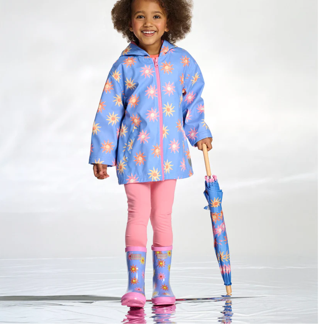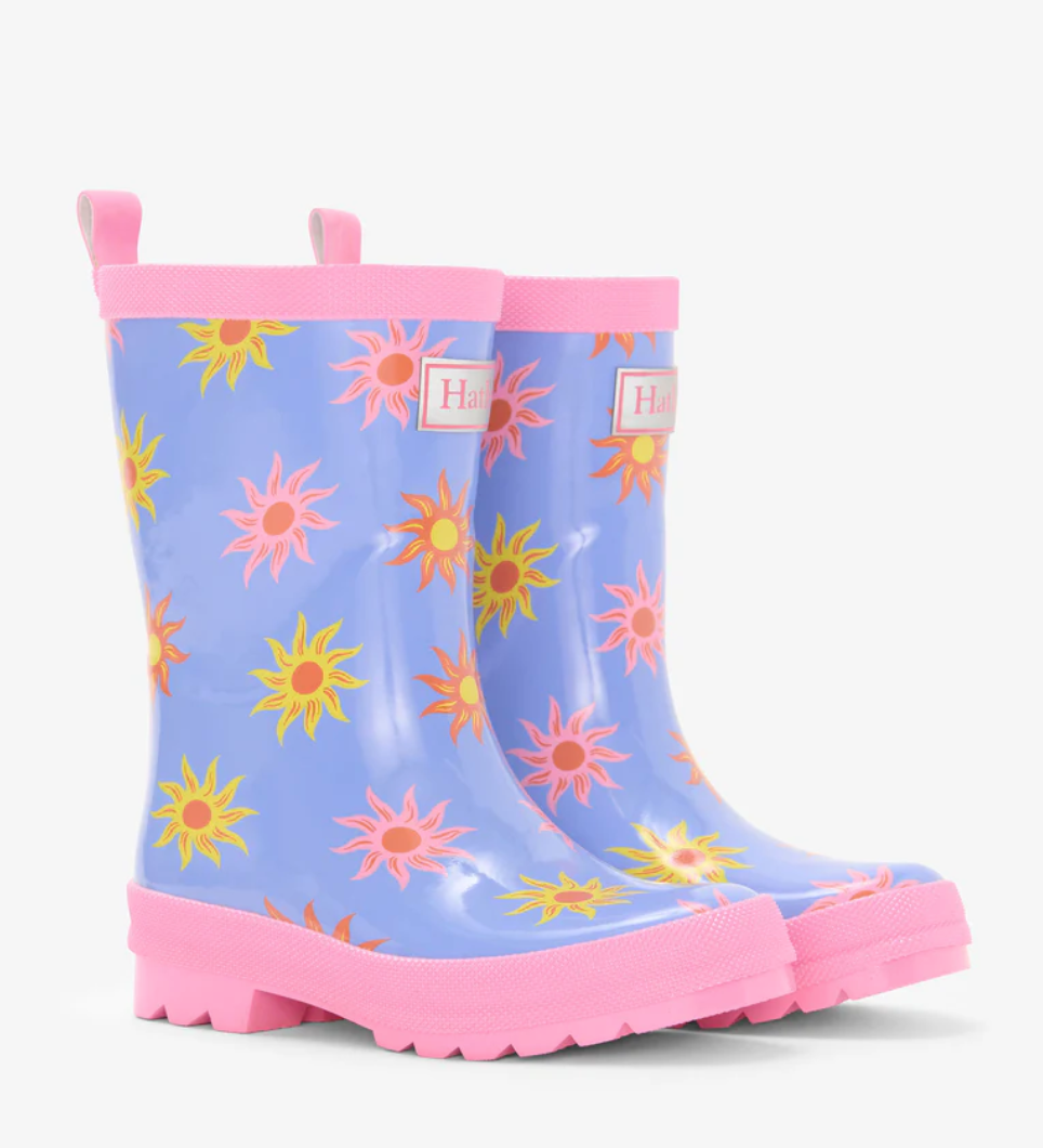 Bring sunshine to rainy days with these cheerful sun-print rain boots designed to keep feet dry. Featuring a light blue background with an all-over print of orange, yellow, red, and pink suns, they’re accented with a light pink base, cuffs, pull tab, and bold stripe on the back, finished with a thin red stripe for contrast. These boots are handcrafted from durable rubber and built with non-slip soles, making them a fun and functional choice for splashing through puddles and chasing sunshine after the rain.