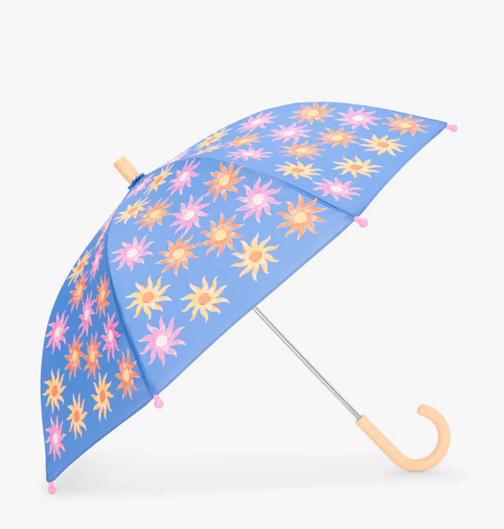 This umbrella brings sunshine to even the grayest rainy days. Featuring a light blueish purple background with an all-over print of pink, orange, and yellow suns, it adds a splash of colour to wet-weather adventures. It includes a classic wooden handle that’s easy for small hands to grip securely. Finished with playful pink tips, this umbrella is perfect for weathering the storm in style. Pairs well with the Sunny Raincoat and Boots.