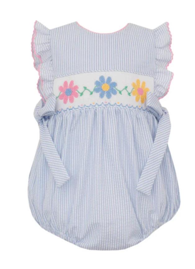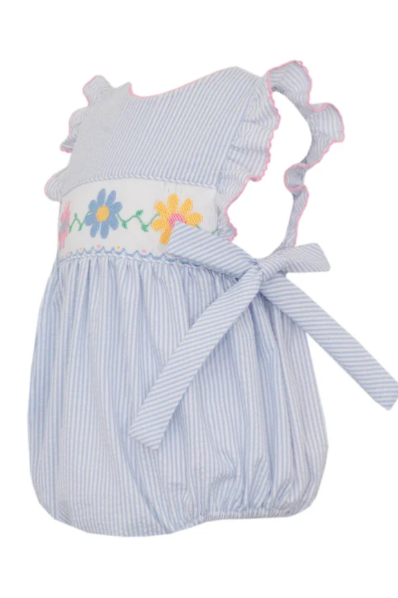 This blue and white striped bubble has ruffle sleeves, side bows and features embroidered daisies trim in fresh spring colors. It has back buttons and bottom snaps. The seeersucker material makes it perfect for a hot summer day.