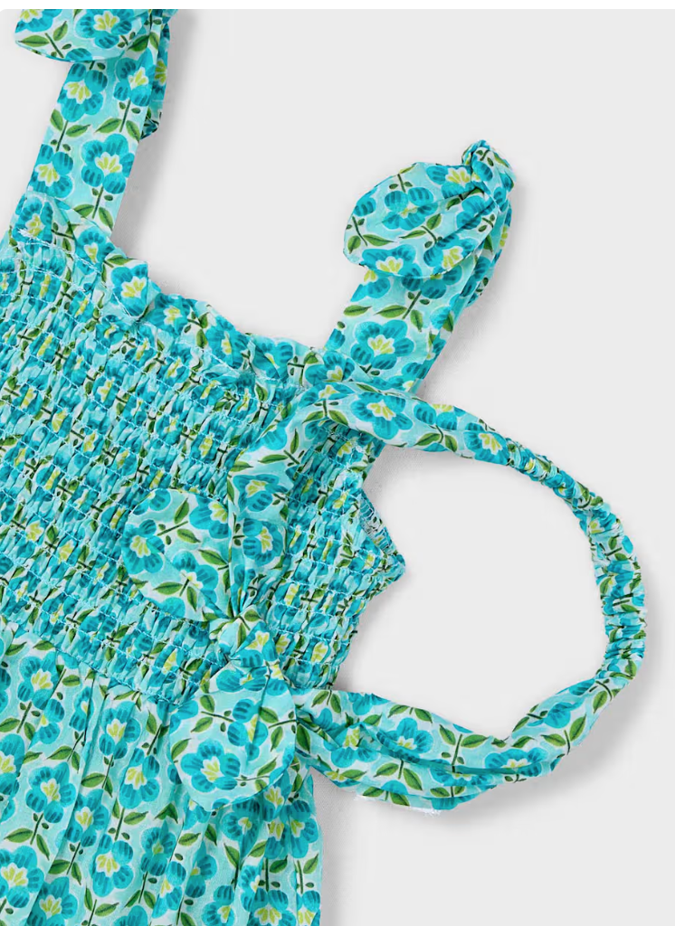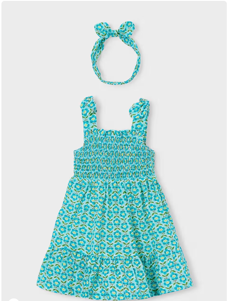 This bright sundress features a flower print in the colors of a sunny ocean day. It has a smocked top, bows at the sleeves and a ruffle at the bottom. It comes with a matching headband. Perfect for hot summer days.