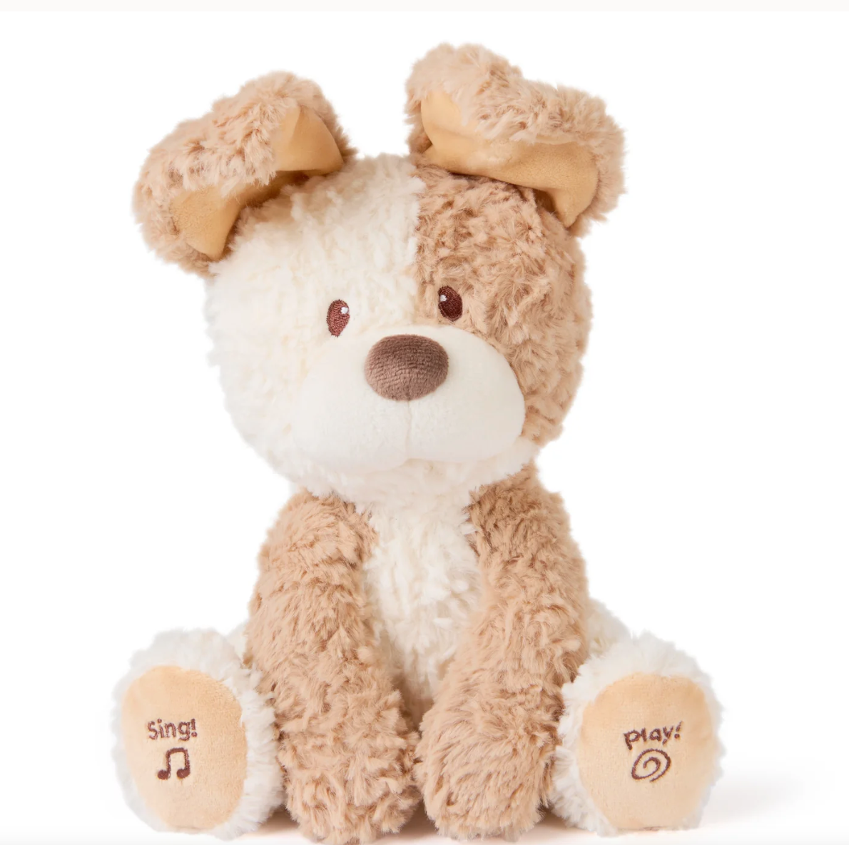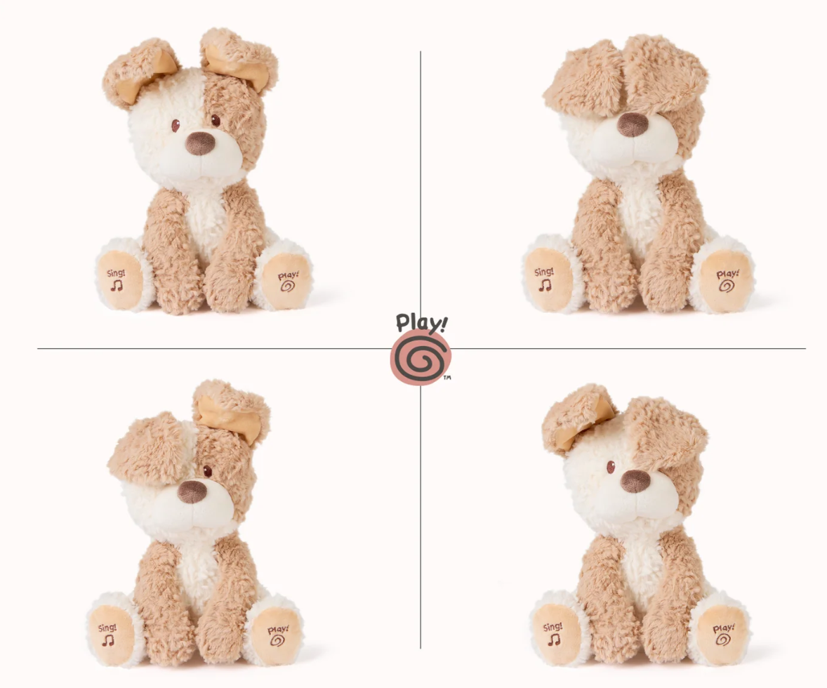 Press this cute puppy's right paw to begin a fun game of peek-a-boo! He uses his short, floppy ears to cover its eyes and hide, occasionally taking a cheeky peek at baby with just one ear. Then, for a fun surprise, press Peeki’s left paw pad - Peeki sings a unique peek-a-boo song! This cuddly puppy was also made for snuggle sessions and boasts a fluffy coat of cream and sandy-tan plush with a soft cream muzzle, chocolate-brown nose, and matching embroidered eyes. The puppy's sweet expression and adorable voice will have your little ones giggling and ready to play!