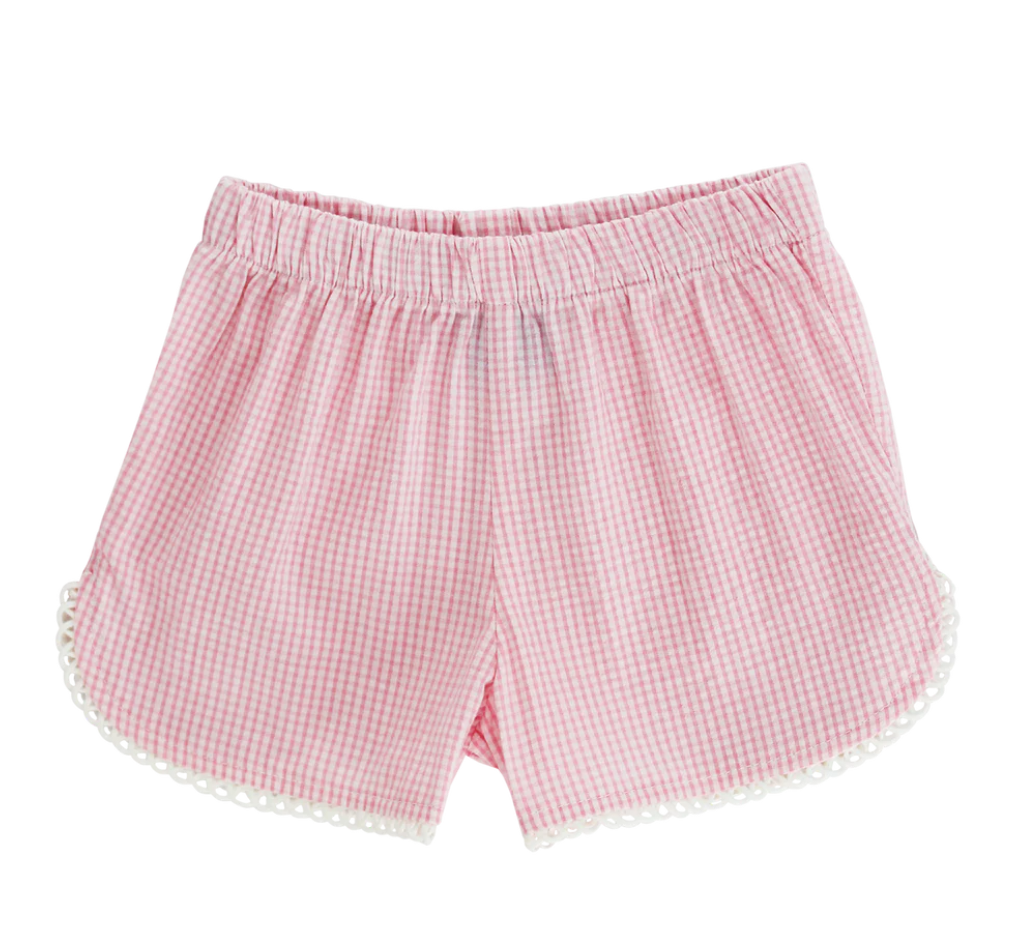 This Pink Check Seersucker Short is a darling essential featuring soft gathers and delicate checks. With cute scallop trim, the cotton fabric makes it lightweight and refined. Perfect for hot summer days. Pairs well with our White Knit Onesie.