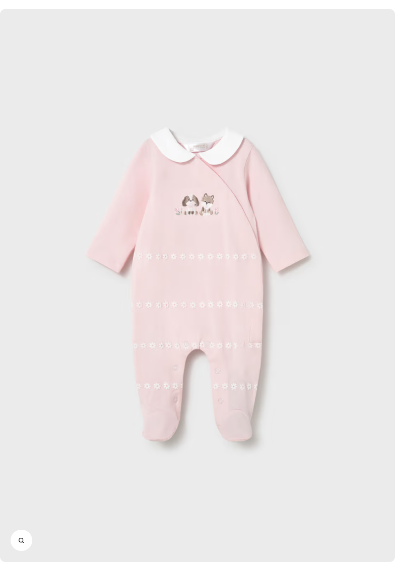 This darling onesie features a white peter pan collar and 2 cute embroidered puppies. It is ringed with an embossed daisy pattern. It has snaps along the front and bottom for easy on and off.