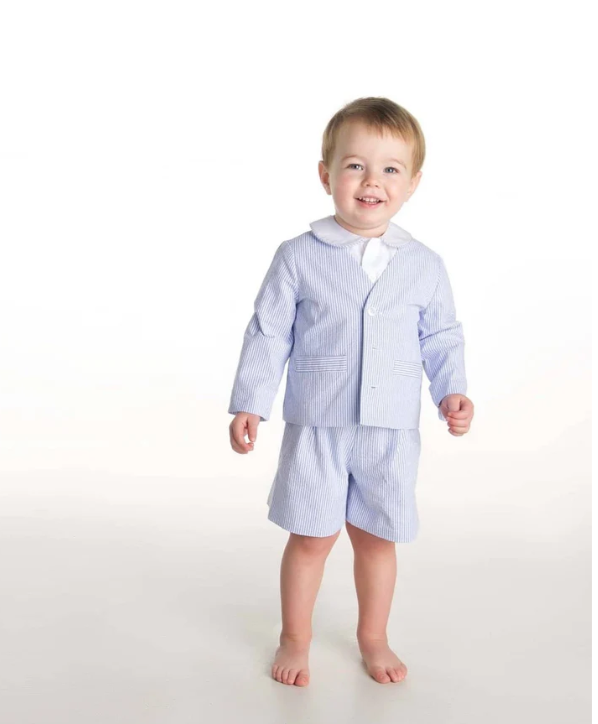 This classic 3 piece suit in blue and white stripe seersucker has a fully lined jacket, shorts with suspenders and a finewale pique short sleeve shirt. The peter pan collar features blue striped piping. Perfect for weddings and other special occasions.