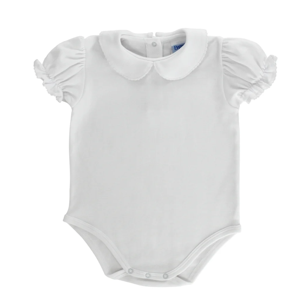 This cotton knit onesie has sweet trim on its peter pan collar and puffed short sleeves. Bottom and back snaps make for an easy on and off. Pairs well with our Pink Checked Ruffle Shorts.