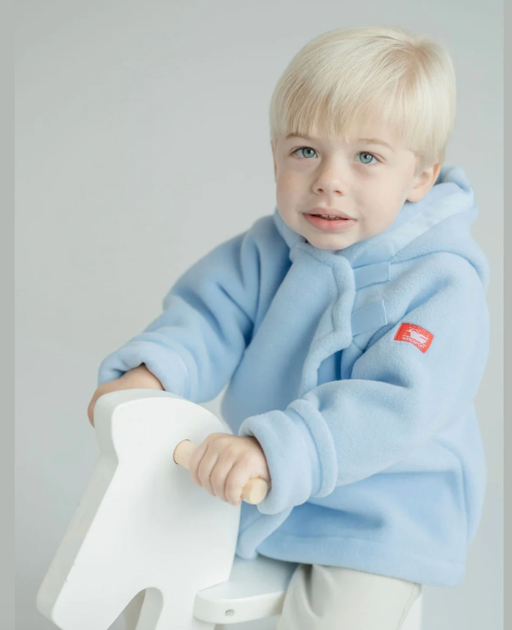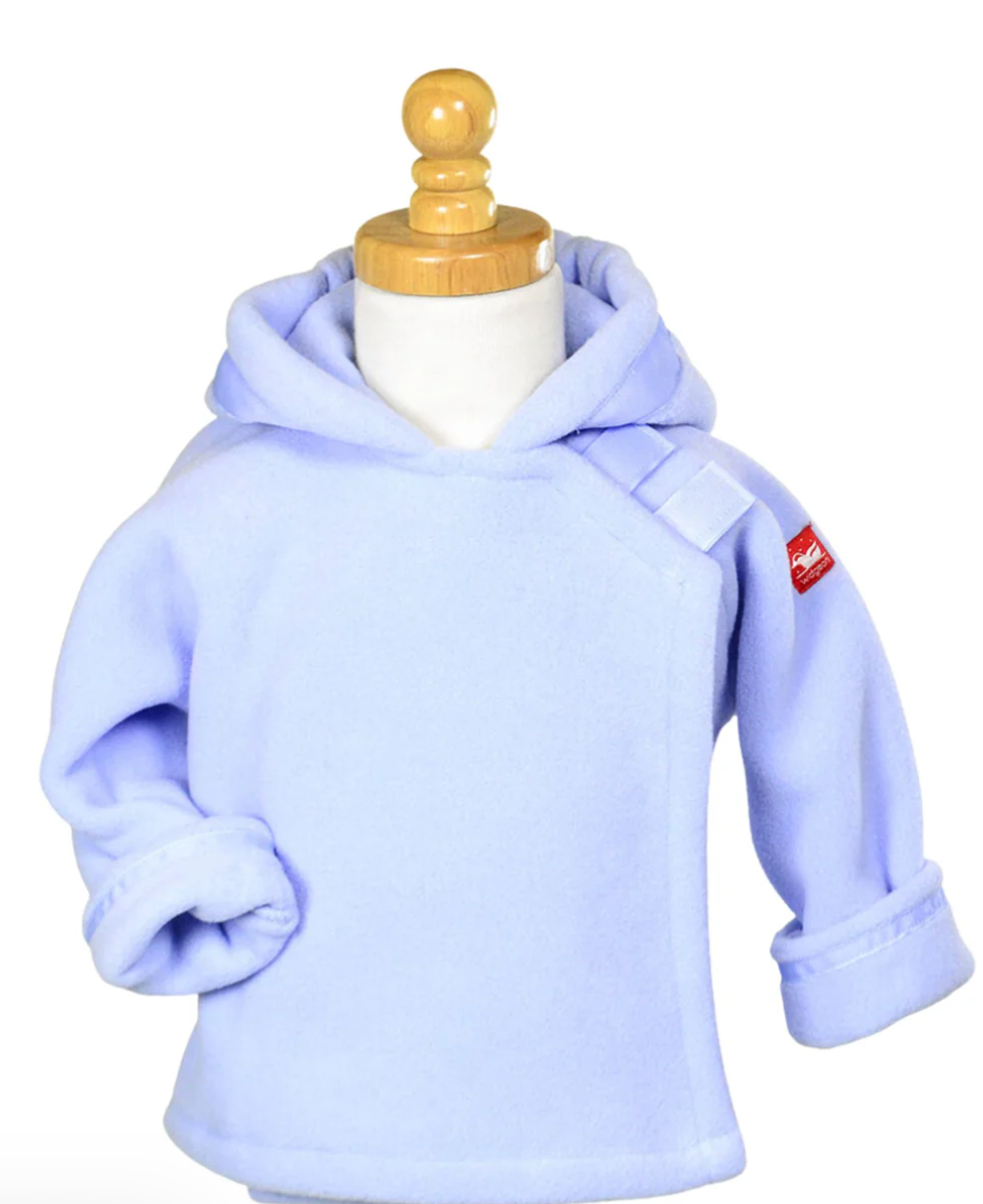 Light blue Polartec fleece jacket from American Widgeon. With hood and cuffed sleeves, the unstructured cross-over style will fit your little one longer than the season. Easy velcro closure and cute grosgrain ribbon trim. Machine wash and dry. Made In the U.S.